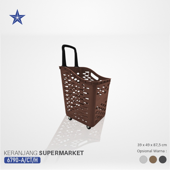 TROLI KERANJANG BELANJA PLASTIK SUPERMARKET LUCKY STAR 6790-DX VOL. 70 LITER adalah keranjang belanja yang dilengkapi dengan roda dan handle tarik, sehingga memudahkan pengguna dalam membawa barang tanpa harus mengangkatnya.