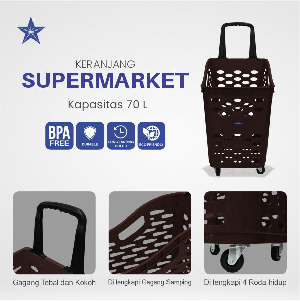 TROLI KERANJANG BELANJA PLASTIK SUPERMARKET LUCKY STAR 6790-DX VOL. 70 LITER WARNA COKLAT, ABU & HITAM
